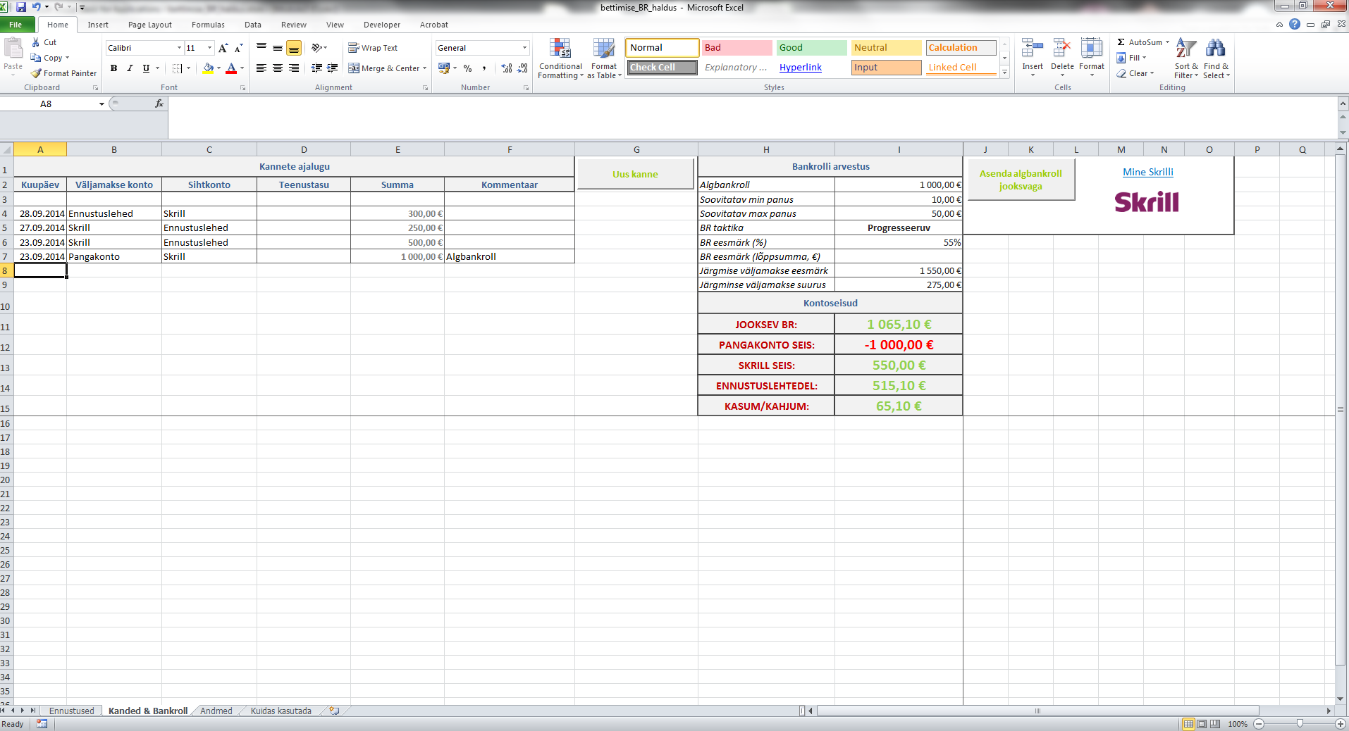 Kanded & Bankroll alamleht on mõeldud panustaja erinevatest kontoseisudest ülevaate andmiseks. Panustaja saab lisada kõik kontodevahelised liikumised tabelisse ning nende ülekannete alusel toimub nii kontoseisude kui ka bankrolli arvutus.
