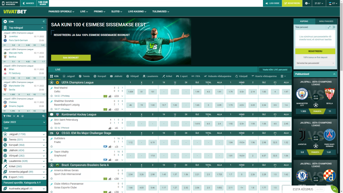 Kõik uued registreerujad saavad valida 10€ riskivaba panuse ja 100% kuni 100€ esimese sissemakse liitumisboonuse vahel. Vaata ülalolevast boonuse tutvustusest kuidas see lunastada ning millised on reeglid ja tingimused. Nii uued kui ka juba kontot omavad kasutajad saavad osaleda erinevates piiratud ajal kehtivates kampaaniates. Kõik käimasolevad pakkumised leiad VivatBet boonuste lehelt.